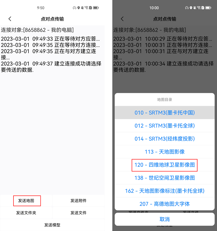 在手機端[點對點傳輸]界面,點擊【發(fā)送地圖】,選擇地圖文件。