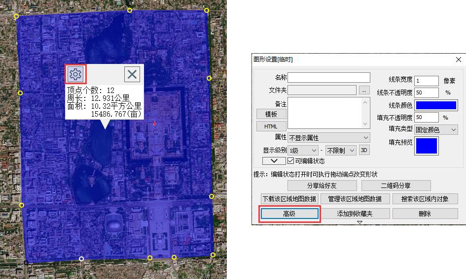 下載地圖后,在地圖上點擊區(qū)域,點擊wps9按鈕—>【高級】。