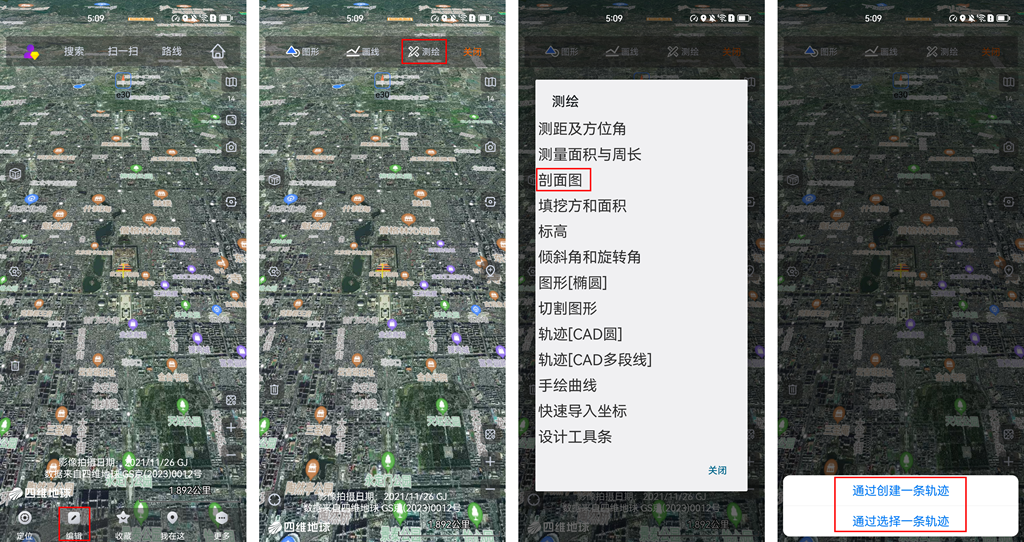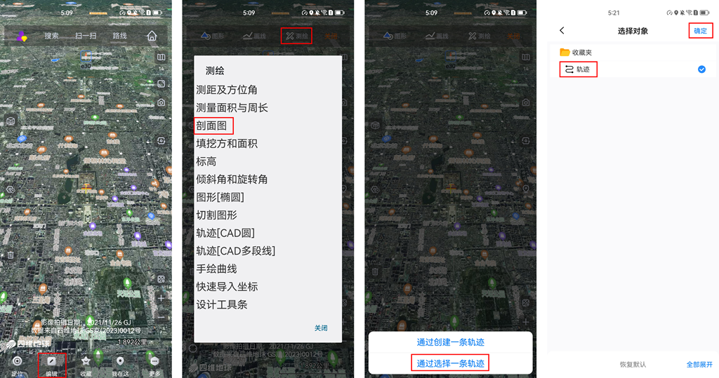 點擊編輯→測繪→剖面圖;這里您可以選擇兩種方式:通過創(chuàng)建一條軌跡、通過選擇一條軌跡。