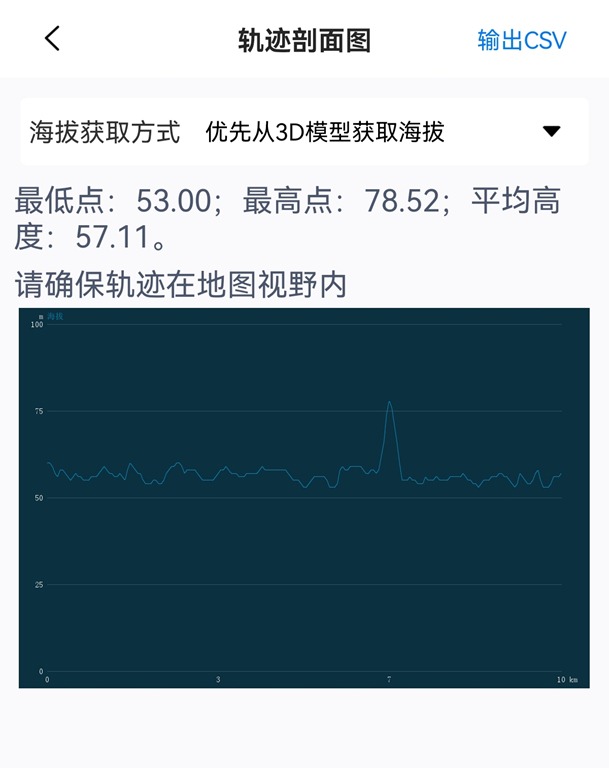 軌跡剖面圖的海拔可選擇通過軌跡點、高程數(shù)據(jù)、3D模型或軌跡點高度與地形高度疊加獲取,直接生成軌跡內(nèi)最低點、最高點及平均高度等數(shù)據(jù)。生成后的軌跡剖面圖可另存為CSV文件格式,方便瀏覽傳閱。