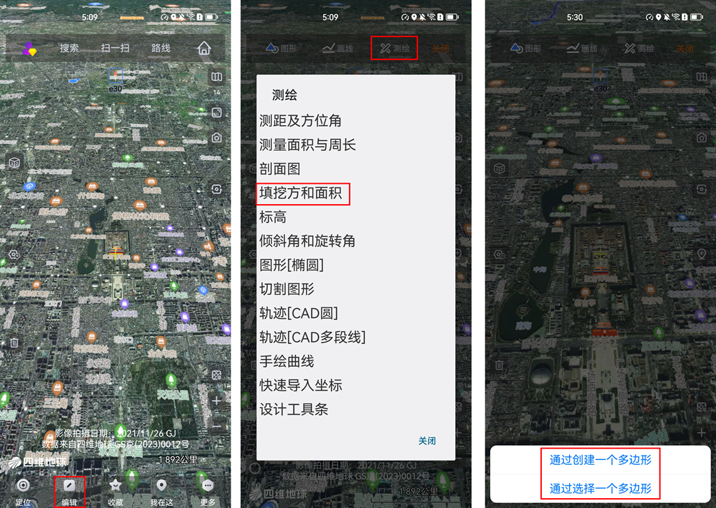 在奧維手機端主界面上,點擊【3D】按鈕,進(jìn)入三維模式,點擊編輯→測繪→挖填方和面積。同樣有兩個選項供您選擇:通過創(chuàng)建一個多邊形、通過選擇一個多邊形(從收藏夾選擇)。
