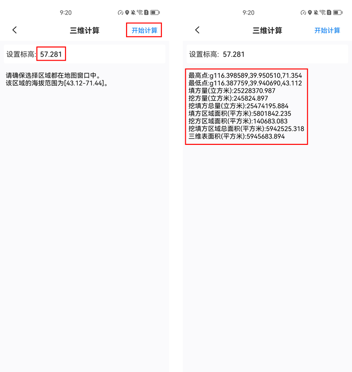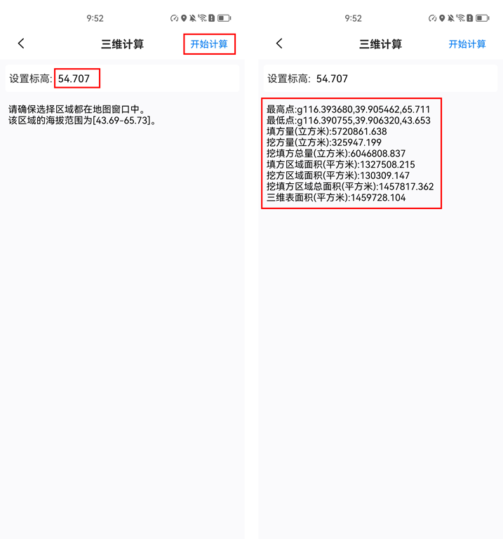 然后您設(shè)置標(biāo)高,點擊【開始計算】,系統(tǒng)自動計算出最高點、最低點、挖填方量、挖填方區(qū)域面積、三維表面積等數(shù)據(jù)。