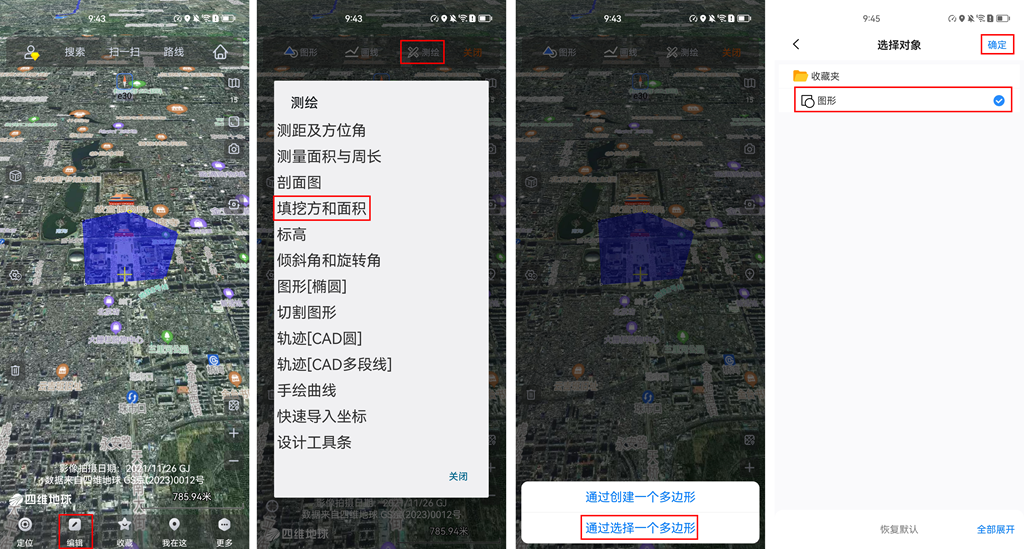 點擊編輯→測繪→挖填方和面積→通過選擇一個多邊形,選擇一個多邊形,點擊【確定】。