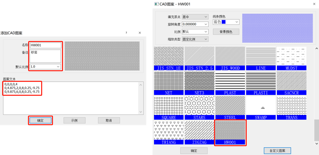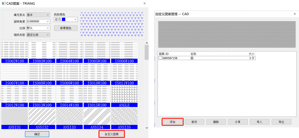 添加完成后,點(diǎn)擊【確定】,關(guān)閉[自定義圖案管理--CAD]對話框。