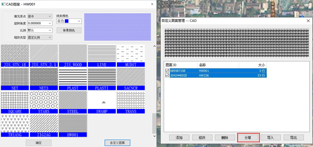 在奧維電腦端,進(jìn)入[自定義圖案管理--CAD]對話框,勾選需要分享的圖案,點(diǎn)擊【分享】。