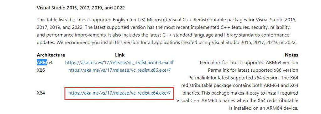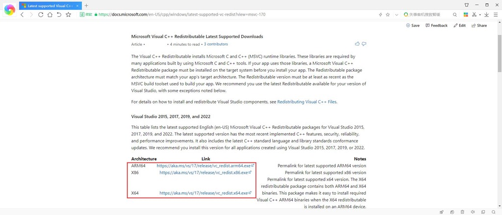 在瀏覽器中輸入網(wǎng)址(https://docs.microsoft.com/en-US/cpp/windows/latest-supported-vc-redist?view=msvc-170),下面有三個(gè)版本的VC++ Redist運(yùn)行庫,您根據(jù)自己電腦的實(shí)際配置選擇。