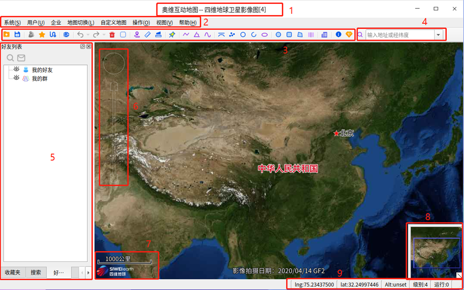(1)標(biāo)題欄:包含軟件名稱、當(dāng)前綁定機(jī)器VIP等級、地圖類型及其當(dāng)前顯示級別;當(dāng)用戶登錄奧維賬號和企業(yè)賬號時,會增加顯示當(dāng)前登錄的用戶名和企業(yè)用戶名。