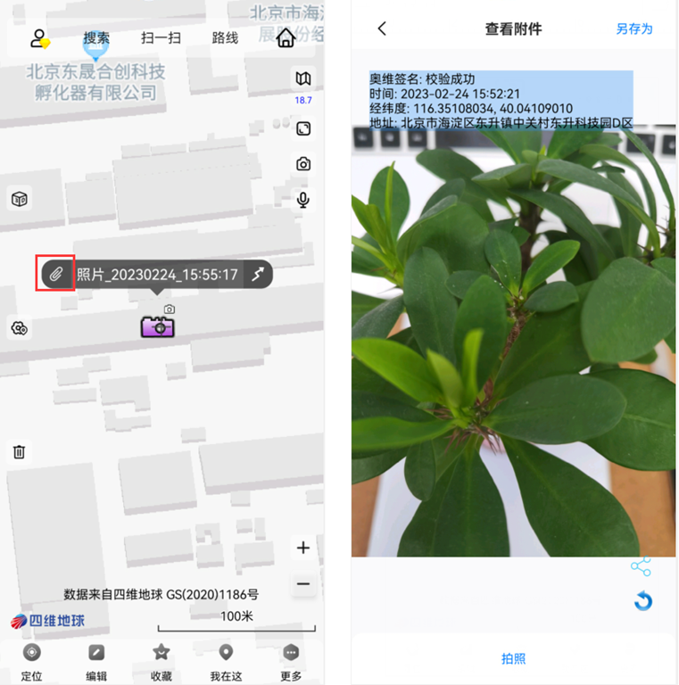 (2)再點(diǎn)擊左側(cè)的6,在打開(kāi)的查看附件窗口查看標(biāo)簽附件,點(diǎn)擊此窗口下面的拍照可以繼續(xù)添加照片附件,點(diǎn)【另存為】可將圖片保存在SD卡下的Android/data/com.ovital.ovitalMap/files/omap文件夾之中。
